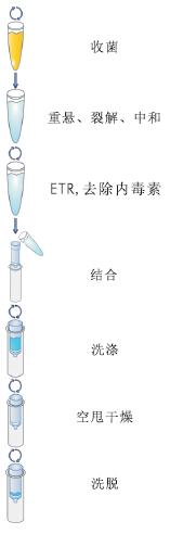 內(nèi)毒素(Endotoxin)是革蘭氏陰性菌細(xì)胞壁上的一種脂多糖,它能引起哺乳動(dòng)物發(fā)熱,甚至?xí)?dǎo)致動(dòng)物休克。常規(guī)的質(zhì)粒純化試劑盒由于無法去除內(nèi)毒素的污染,從而大大降低了質(zhì)粒轉(zhuǎn)染的效率。Omega公司采用獨(dú)特的內(nèi)毒素吸附緩沖液(ETR Solution),能有效去除質(zhì)粒中的內(nèi)毒素污染,純化的質(zhì)粒中內(nèi)毒素含量小于0.1EU/µg,可大大提高轉(zhuǎn)染實(shí)驗(yàn)效率和動(dòng)物注射效果。從培養(yǎng)過夜的菌液中收集細(xì)菌后,采用經(jīng)典的堿裂解法裂解細(xì)菌,離心去除染色體DNA和蛋白質(zhì),得到含有質(zhì)粒和內(nèi)毒素的上清液,加入ETR Solution吸附內(nèi)毒素,得到不含內(nèi)毒素的上清液,調(diào)節(jié)結(jié)合條件并轉(zhuǎn)移至硅膠柱,離心吸附質(zhì)粒DNA,經(jīng)兩種溶液洗滌去除殘余蛋白質(zhì)和各種雜質(zhì),最后用Endotoxin-free Elution Buffer洗脫出質(zhì)粒DNA。