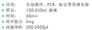 該試劑盒使用傳統(tǒng)的堿裂解法和磁珠純化方式相結(jié)合,適合于從200-250ml的菌液中純化1-2mg高純度的質(zhì)粒DNA,以及 BACs, PACs、粘粒等大片段的質(zhì)粒DNA。純化所得質(zhì)??梢灾苯佑糜跍y序、標(biāo)記、酶切等下游操作。