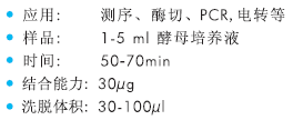 該試劑盒把硅膠柱純化技術同經(jīng)典的SDS堿裂解法結合起來,用戶可在1小時內(nèi)從酵母培養(yǎng)液中純化出高純度的質(zhì)粒DNA。純化過程不需用任何到有害的有機物抽提,亦不需用到耗時的乙醇沉淀。質(zhì)粒DNA的產(chǎn)量依賴于酵母攜帶質(zhì)粒的拷貝數(shù),酵母菌株以及生長條件。