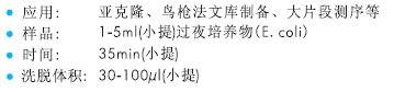 小提試劑盒適合于從1-5ml細(xì)菌培養(yǎng)液中純化大分子量的質(zhì)粒載體,或各種BAC,PAC,粘粒,Cosmid等載體。細(xì)菌收集后,加入Buffer T1/T2裂解,再加入Buffer T3離心沉淀去除蛋白質(zhì)和染色體DNA,在得到的上清液中加入獨(dú)特的結(jié)合液并轉(zhuǎn)移至結(jié)合柱進(jìn)一步去除蛋白質(zhì),經(jīng)過(guò)簡(jiǎn)單的兩次洗滌即可得到高純度的BAC/PAC/P1等大片段質(zhì)粒DNA。