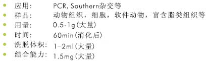 該試劑盒采用中量DNA結(jié)合柱純化方式,適合于從富含脂肪,多糖,纖維(如腦、脂肪、肌肉或肝臟)等樣品中提取DNA。另外,該試劑盒也適用于提取軟體動(dòng)物、昆蟲、節(jié)肢動(dòng)物或無(wú)脊椎動(dòng)物樣品中富含粘多糖的組織 。一次可處理高達(dá)500mg的樣品。 組織樣品在含有CTAB的高鹽溶液中裂解然后經(jīng)過(guò)蛋白酶消化,加入氯仿抽提后離心溶液分層,吸取上清加入Buffer BL調(diào)節(jié)結(jié)合條件,然后加入到硅膠柱中結(jié)合。 經(jīng)兩步快速洗滌后去除鹽和其他雜質(zhì),最后加入Elution Buffer或滅菌水洗脫基因組DNA。純化的DNA可直接用于酶切、PCR或雜交等下游實(shí)驗(yàn)。