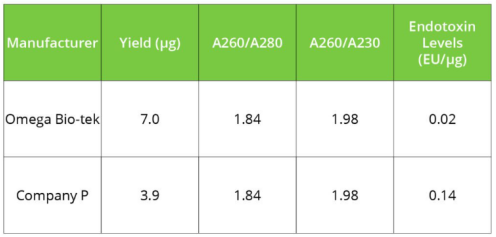 按照說明書操作步驟,使用磁珠法無內(nèi)毒素質(zhì)粒小量提取試劑盒以及競品公司試劑盒,從1.5mL DH5α培養(yǎng)基(n=3)中提取pGEM質(zhì)粒DNA。使用Thermo Scientific的NanoDropTM 2000c分光光度計對提取的質(zhì)粒DNA進行測定。Omega Bio-tek試劑盒提取的質(zhì)粒內(nèi)毒素(<0.1 EU/μg)水平更低,產(chǎn)量也高于競品公司。