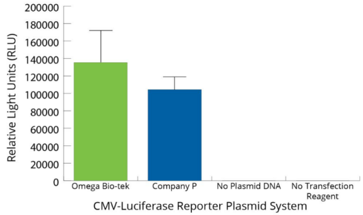 從1.5mL DH5α培養(yǎng)基(n=3)制備pGEM質(zhì)粒,并使用磁珠法無內(nèi)毒素質(zhì)粒小量提取試劑盒以及競品公司的等效試劑盒進行提取。使用2μL Lipofectamine轉(zhuǎn)染試劑,將200ng純化好的質(zhì)粒轉(zhuǎn)染到10,000個細胞中。使用Omega Bio-tek試劑盒純化的質(zhì)粒產(chǎn)生更高的生物發(fā)光信號,與競品公司相比轉(zhuǎn)染效率更高。