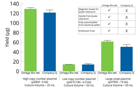按照說明書操作步驟,使用磁珠法無內(nèi)毒素質(zhì)粒中型試劑盒以及競(jìng)品公司的試劑盒,從DH5α培養(yǎng)基(n=3)中提取不同類型和大小的質(zhì)粒。使用Thermo Scientific 的NanoDrop™ 2000c分光光度計(jì)對(duì)提取的質(zhì)粒DNA進(jìn)行測(cè)定。所有質(zhì)粒產(chǎn)量均具有可比性,上圖顯示Omega Bio-tek試劑盒優(yōu)于競(jìng)品公司試劑盒。