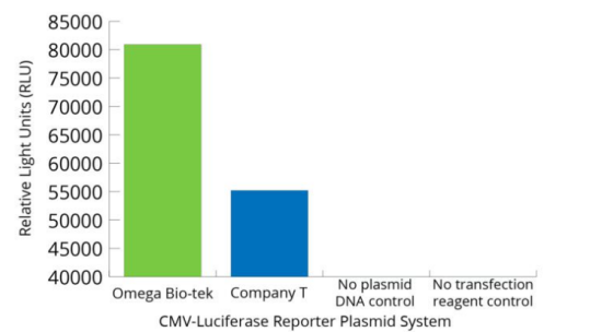 從5mL DH5α培養(yǎng)基(n=3)制備質(zhì)粒pGL4.51,并使用MagBinder® Fit24核酸提取儀上的磁珠法質(zhì)粒中量提取試劑盒與競(jìng)品公司的等效試劑盒進(jìn)行提取。使用2μL Lipofectamine轉(zhuǎn)染試劑,將200ng提取好的質(zhì)粒轉(zhuǎn)染到10,000個(gè)細(xì)胞中。使用Omega Bio-tek試劑盒提取的質(zhì)粒生物發(fā)光信號(hào)更高,與競(jìng)品公司相比,轉(zhuǎn)染效率更高。