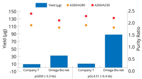 在MagBinder® Fit24核酸提取儀上,使用磁珠法無內(nèi)毒素質(zhì)粒中量提取試劑盒以及競(jìng)品公司試劑盒,按照說明書操作步驟,從5mL DH5α培養(yǎng)基(n=3)中純化pGEM和pGL4.51質(zhì)粒。使用Thermo Scientific 的NanoDrop™ 2000c分光光度計(jì)對(duì)純化的質(zhì)粒DNA進(jìn)行測(cè)定。Omega Bio-tek試劑盒的質(zhì)粒純化不僅不含內(nèi)毒素(<0.1 EU/μg),而且與競(jìng)品公司的試劑盒相比,產(chǎn)量也顯著更高。